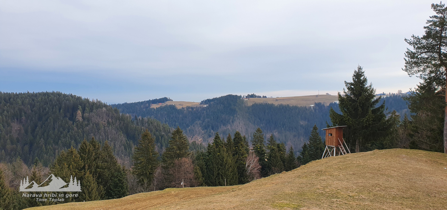 Višje ko izstopim iz gozda pod prvo kmetijo pa se pokažejo lepi razgledi danes je tu kar pihalo.Na drugo stran občudujem vrhove nekateri nimajo imen med njimi izstopa Četrnikov vrh z višino 886 m v daljavi se vidi tudi Svetu Duh.Mimo kmetije in spet po cesti skozi gozd kjer strm vzpon popusti je še do današnjega cilja samo 15 minut.Ko grem še mimo zadnje kmetije po kateri je vrh dobil ime sem nato v 5 minutah na vrhu.Razgleda ni pa vse eno je kar lepo prehoditi to pot.
